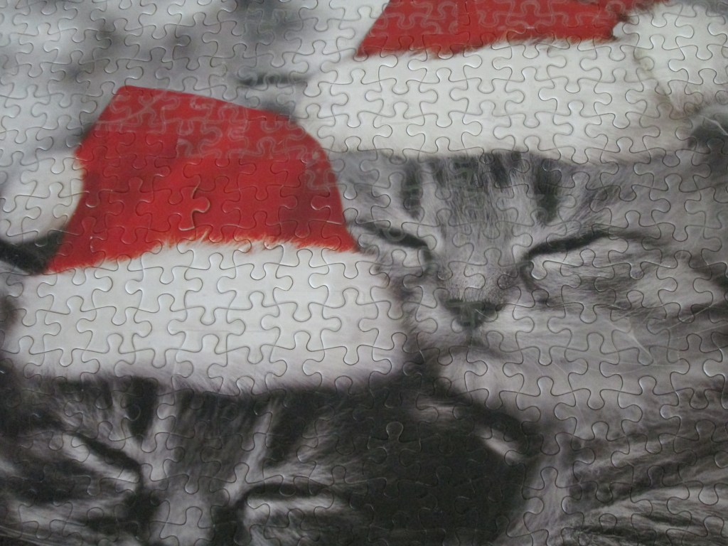 Cute and imperfectly glued, this puzzle did easily pass the adorability test. The badly glued piece is visible in the Santa cap of the kitten on the left.